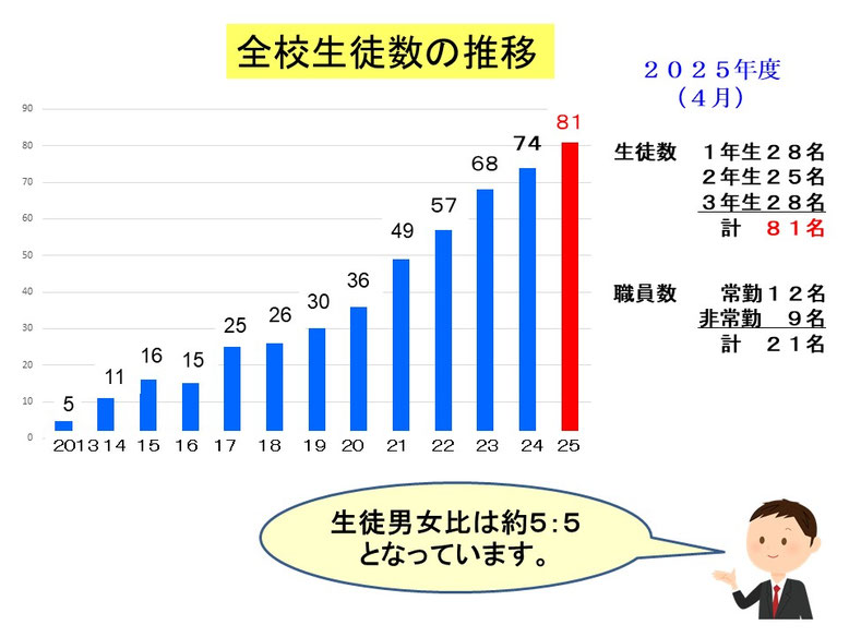 私は今年4月より、赴任8年目を迎えますが、おかげ様をもちまして生徒数、教職員数も年々増え、着実に発展していることにとても喜びを覚えます。(次図参照)